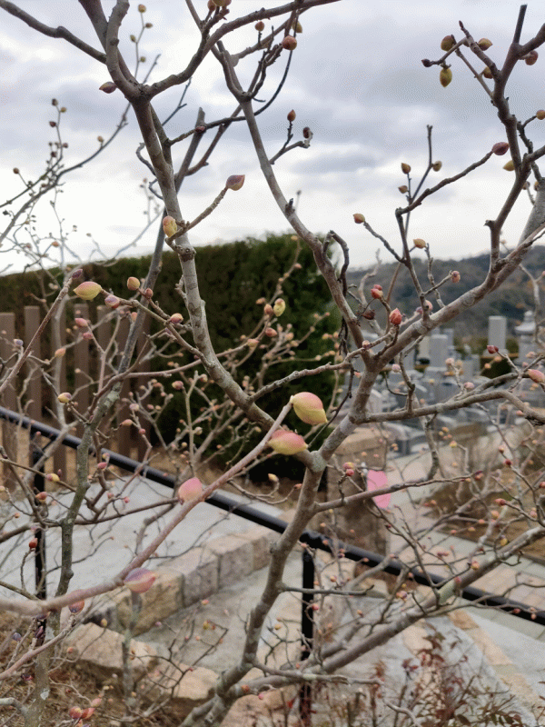 今日は雨天でどんよりしてましたが、霊園は少しずつ春に近づいてます