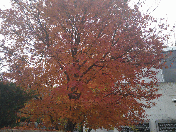 夢咲事務所の近くあある紅葉が一本だけ極めて色が濃く紅葉しております。