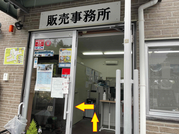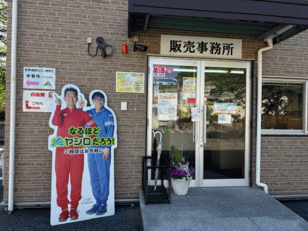 少し見え辛い位置にございますが…販売事務所の左側の壁沿いにありますので