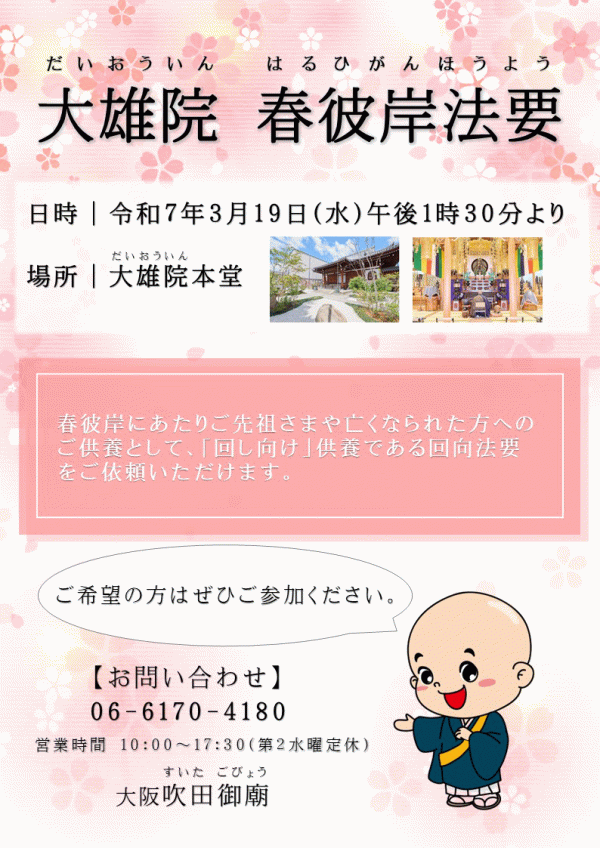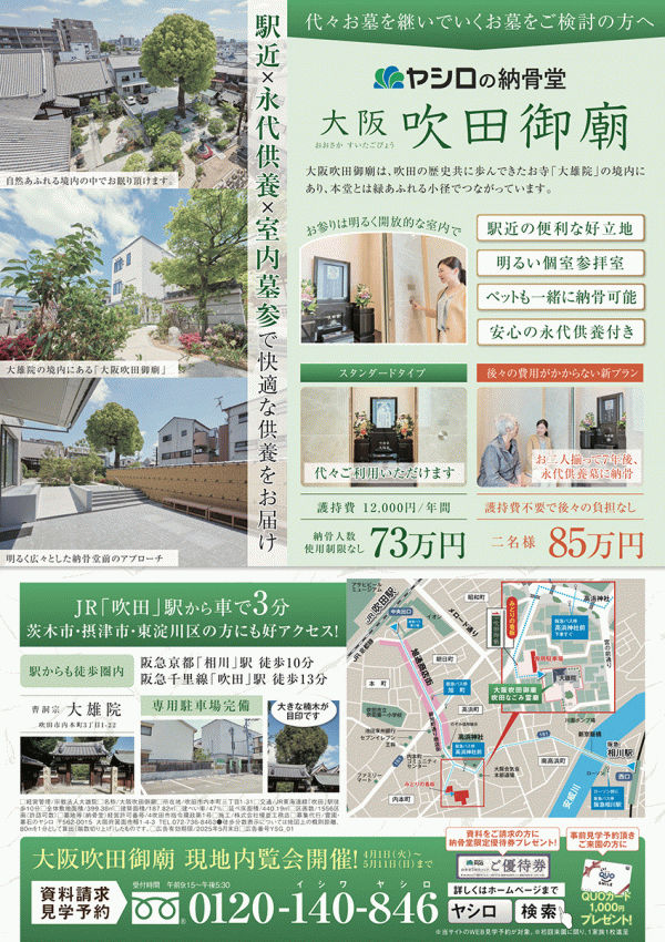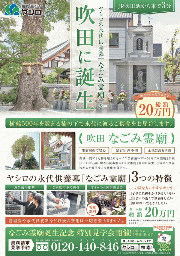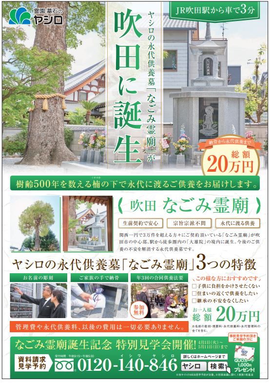 4月12日(土)より配布される吹田なごみ霊廟のチラシをご紹介致します。