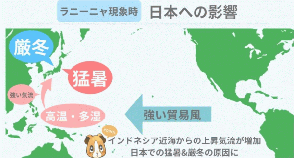 ラニーニャ現象が発生すると「夏はより暑く、冬はより寒く」なるそうです。