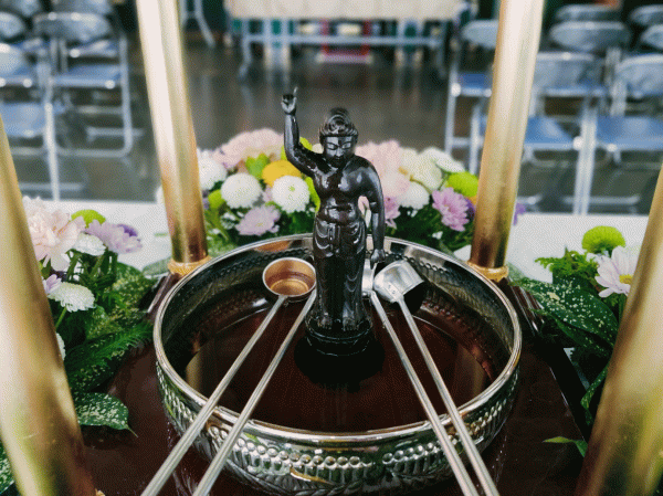 花まつりでは、お釈迦さまが誕生された際、天から神々が降りてきて祝福のために甘露の水を注いだという経典の説示に由来して、お釈迦様の像に甘茶をかけて誕生をお祝いする習わしとなっております。
