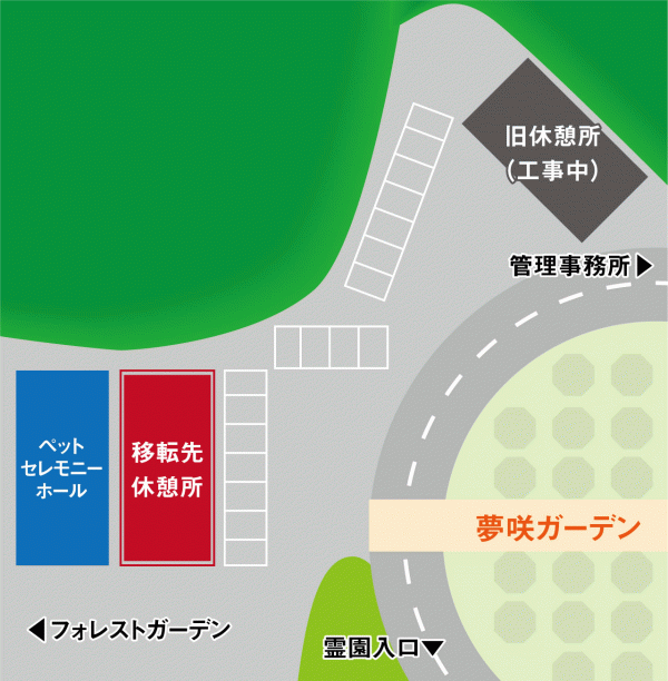 この度、夢咲ガーデンに隣接する休憩所が、建物工事に伴い2024年 11月11日(月)より移転することとなりました。お客様には大変ご迷惑をお掛け致しますが、何卒ご理解の程宜しくお願い申し上げます。