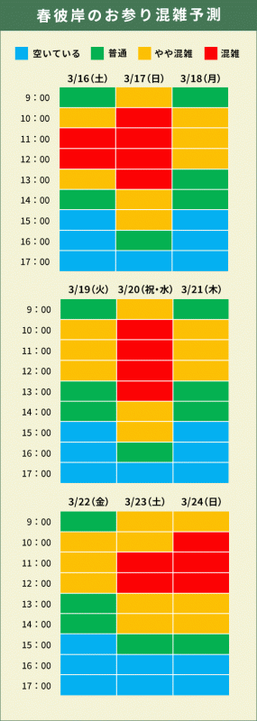 春のお彼岸期間中の混雑具合を予測しておりますので、