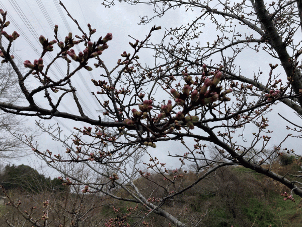 桜の様子ですが、少し蕾が大きくなってきて桜色の花が少し見えています。