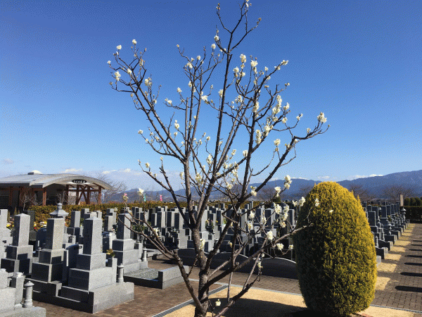 毎朝、園内を巡回しているのですが、霊園事務所裏の梅の花が咲いていました。梅の花を植えている場所は少ないのですが、青空を風景にして綺麗です。お墓参りのお客様も立ち止まって見ている人、写真を撮っている人もいます。奥に少し写っている金剛山もこの陽気なので雪化粧もしていません。
