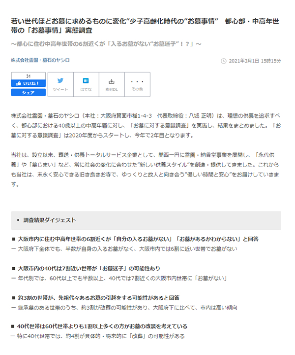 プレスリリース:若い世代ほどお墓に求めるものに変化”少子高齢化時代の”お墓事情” 都心部・中高年世帯の「お墓事情」実態調査