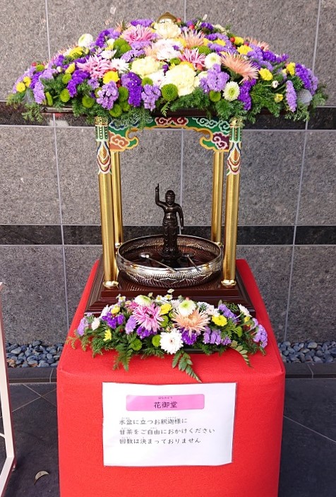 「花御堂」と呼ばれる、水盆に立つお釈迦様に