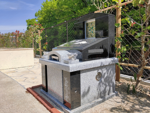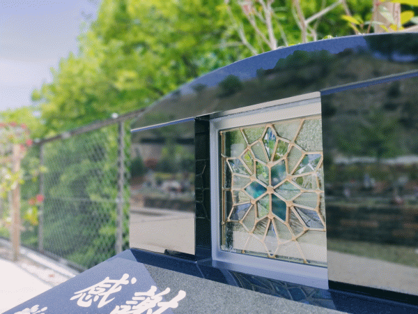 夢咲ガーデンの新区画では、自然の光をやわらかく取り込むステンドグラスを組み込んだ墓石のご提案も行っております。