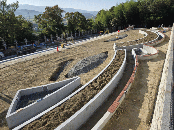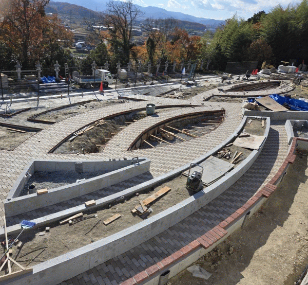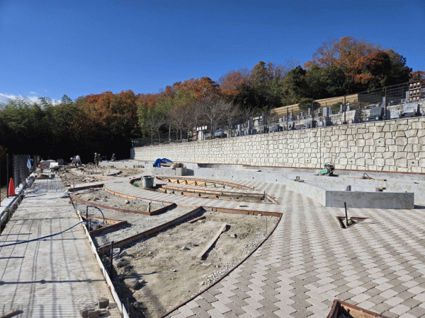 それぞれの区画が立ち上がり、徐々に全体像が見えてきました。高さの違う墓石でエリア内の視界が塞がれず、適度な抜け感が出るよう設計しています。